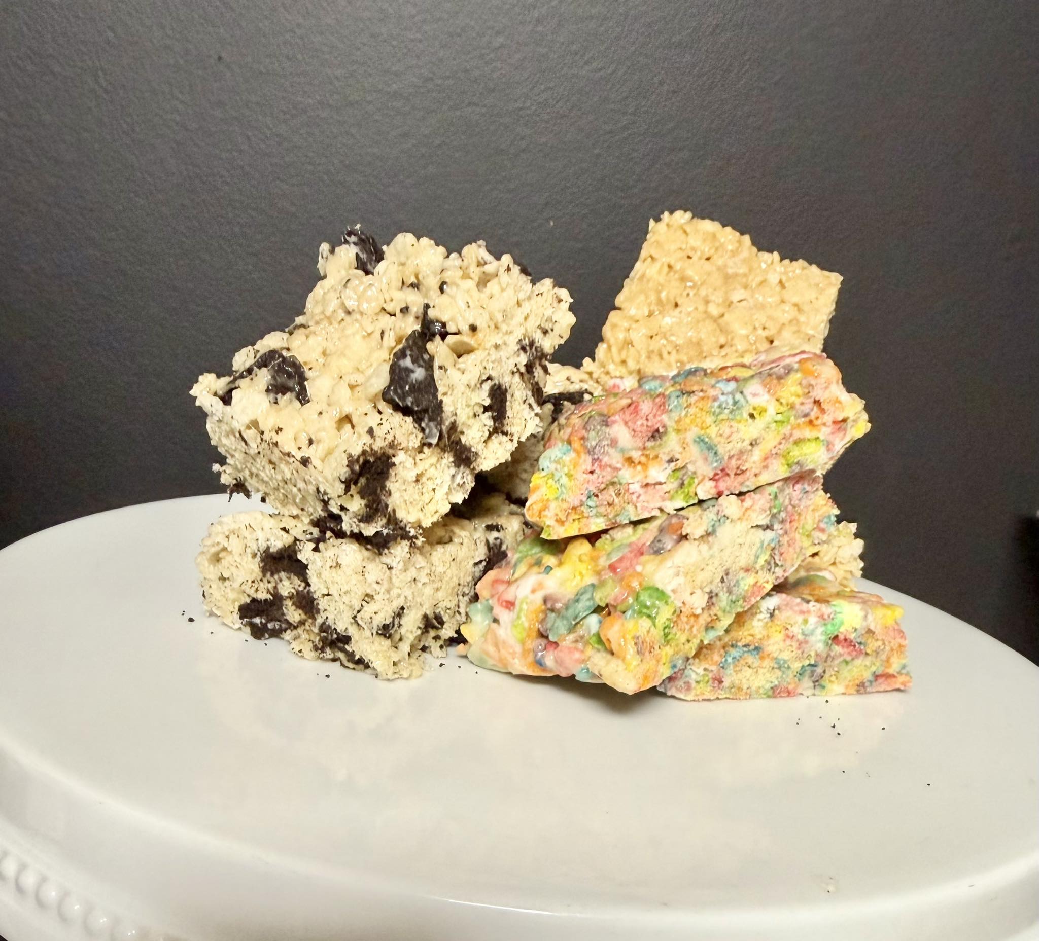 Fruity Dream- buttery, marshmallow fruity pebble cereal bar with white chocolate and dehydrated marshmallows.