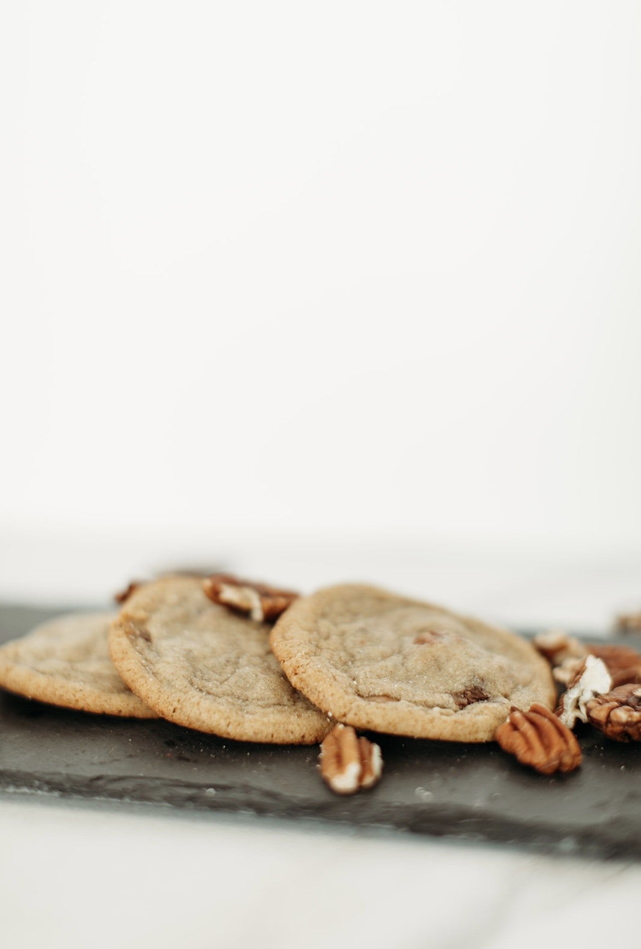 A sugar cookie base infused with cream cheese loaded with caramel, milk chocolate chips, and pecans.